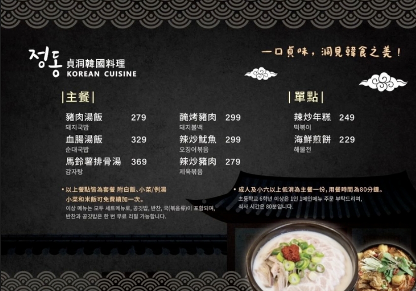 貞洞韓國料理所販售的餐點很簡單,以豬肉湯飯、血腸湯飯、馬鈴薯排骨湯為主,全都是一人份,貼心的是他們家的米飯可以選半碗或一碗。