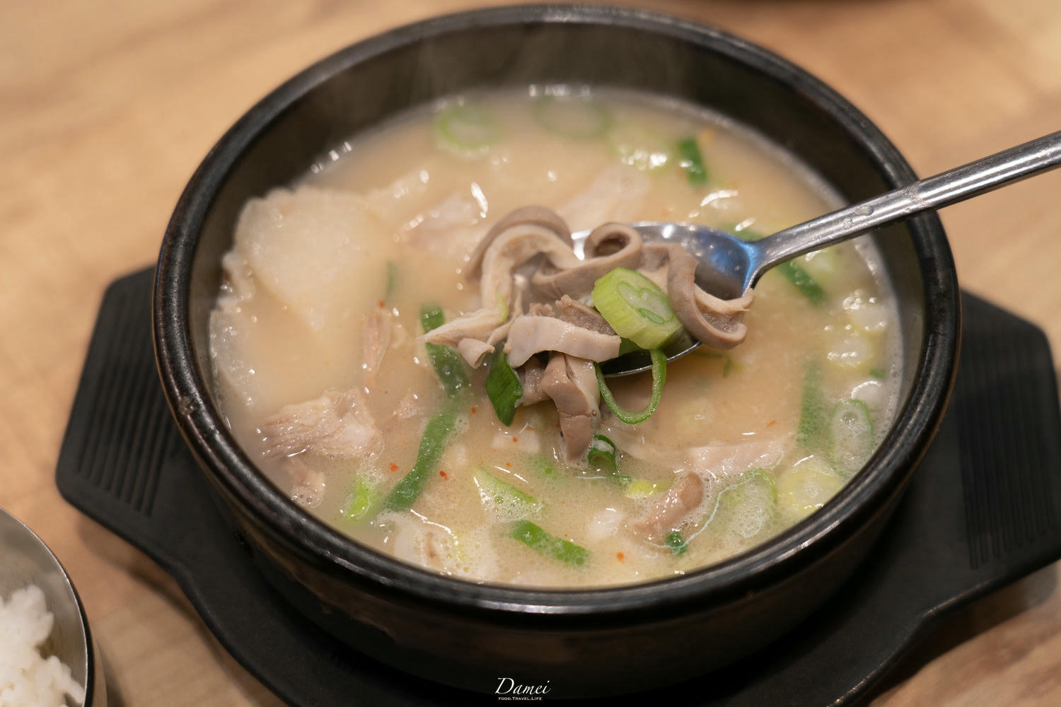 密陽血腸豬肉湯飯的重頭戲來了!使用韓國國產豬骨熬煮48小時的湯頭,我很喜歡這湯頭濃郁又甘甜,將辣醬和蔥拌入湯後,喝一口清爽不已。這豬肉非常的有意思,粉嫩色的,依舊軟嫩好咀嚼。此外可以將附贈的麵線放入湯裡一起享用,或是將米飯挖至湯裡,這就是我喜歡豬肉湯飯的原因!最後我覺得很有意思的是店家還寫了一句話: 客人不是吃湯飯,而是吃「補藥」。在冷天裡喝碗熱騰騰的湯,實在太滿足。