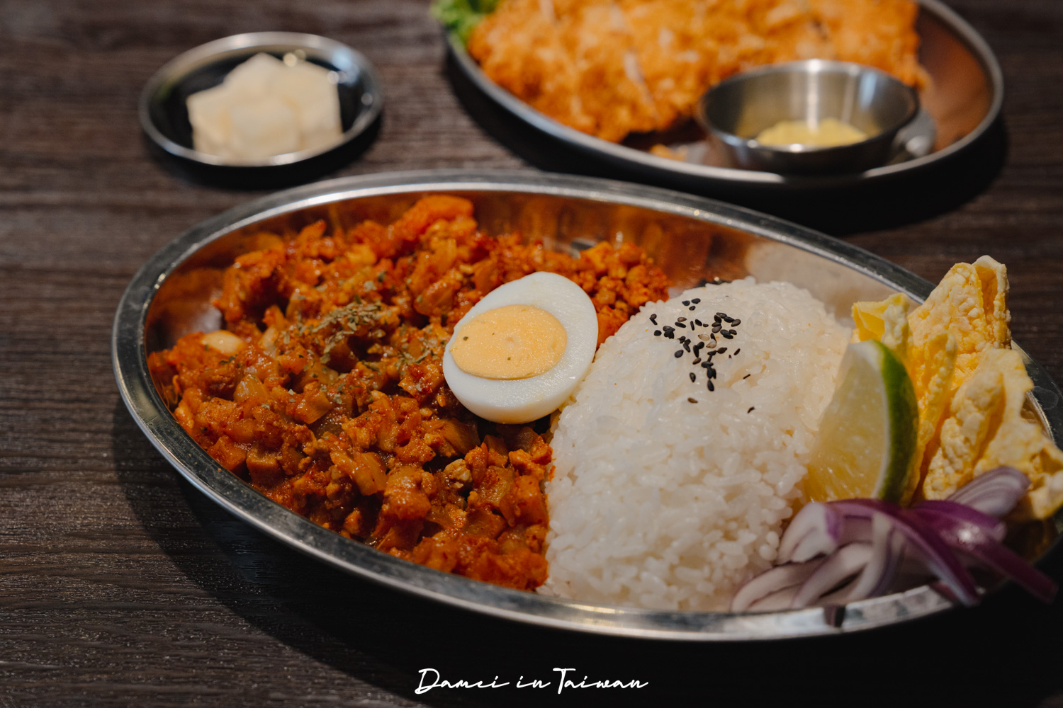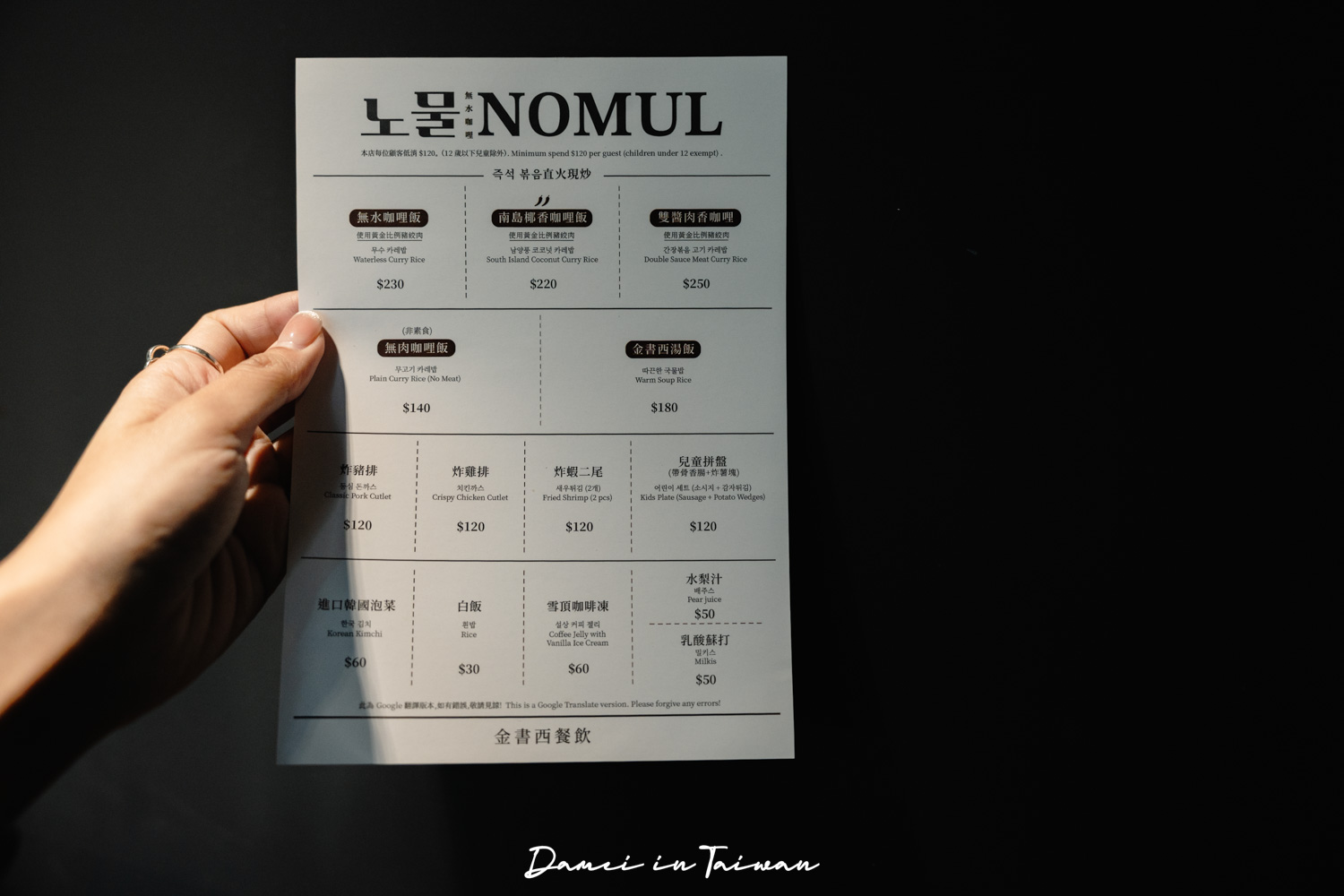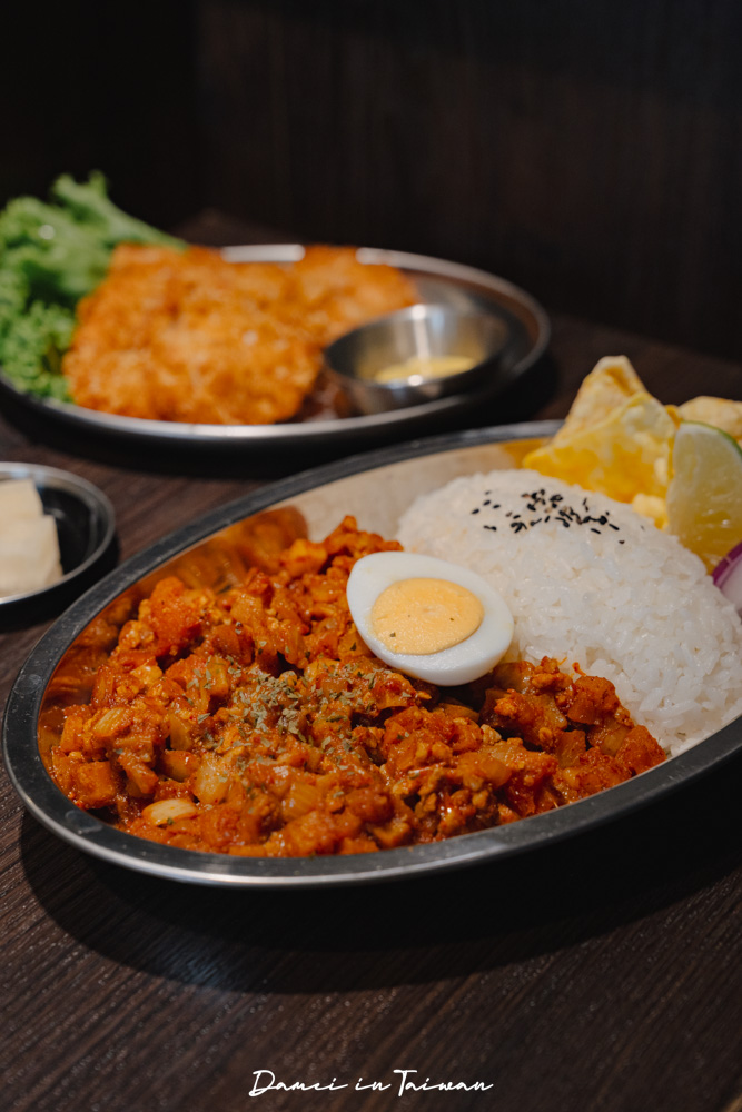 노물nomul無水咖哩天母提供4種咖哩飯,從無水咖哩、南島椰香咖哩、雙醬肉香咖哩以及無肉咖哩飯,小提醒的是他們家的咖哩飯當中,本身就有豬肉末,若覺得不夠,可以再單點豬排、雞排以及炸蝦。若想吃咖哩外的品項,也有金書西湯飯可以選擇。