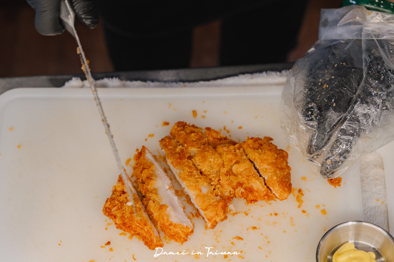 聽到切炸雞排那咖滋的聲響時,我就知道這雞排肯定不簡單。外層裹上麵包粉後再油炸,外皮薄脆,雞肉軟嫩又多汁,本身調味就已經很足,若覺得味道不夠,可以再沾點蜂蜜芥末醬享用。