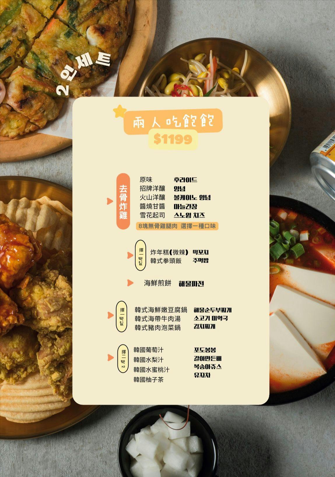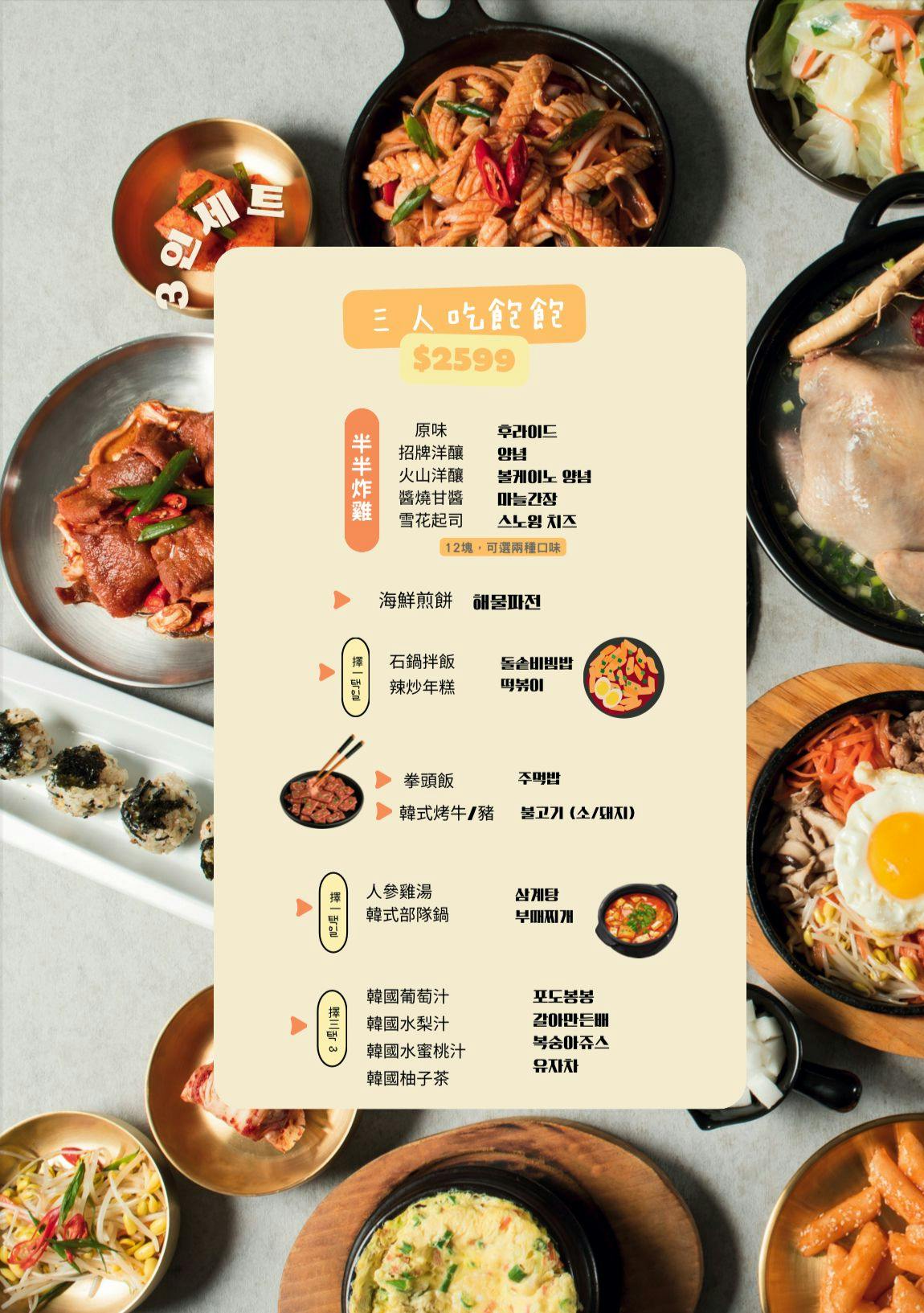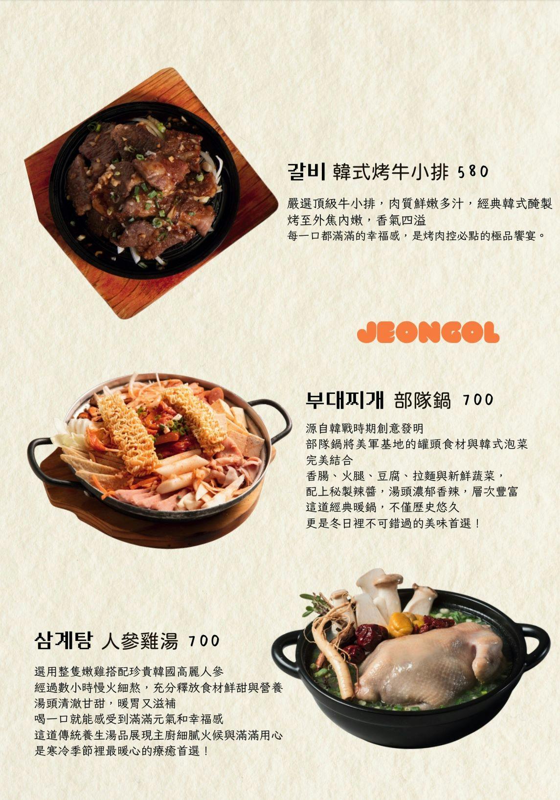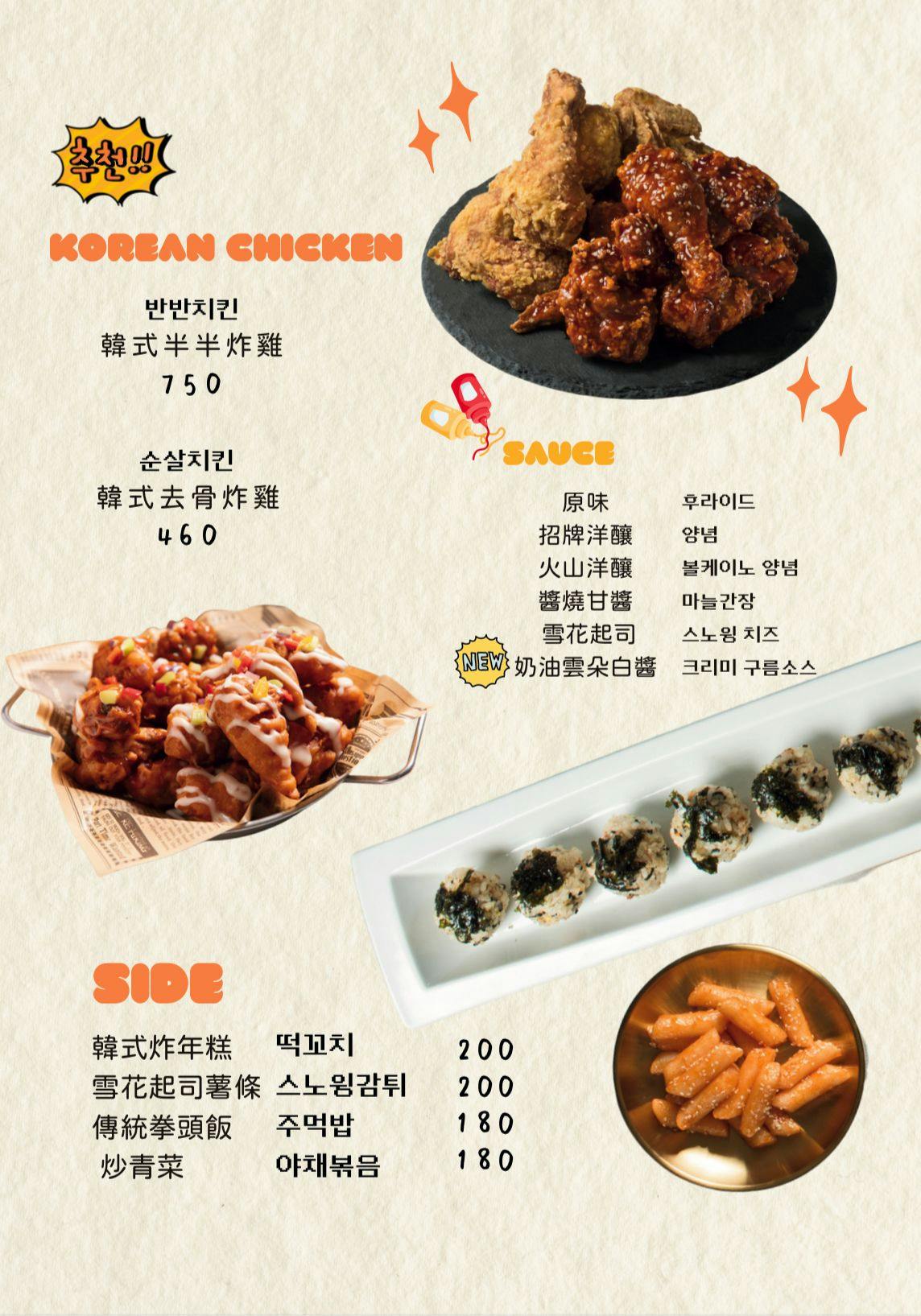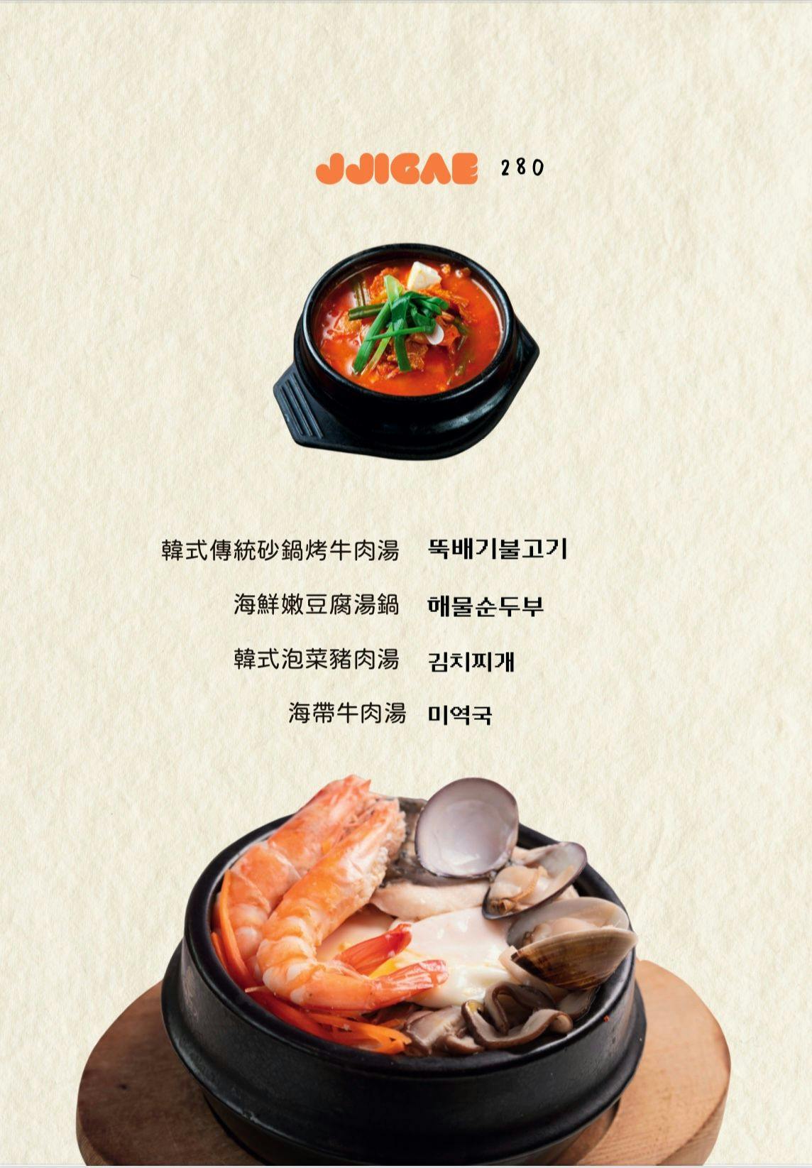 不僅空間換了設計,就連菜單也跟著更換!招牌的炸雞多了新口味,經典的韓式餐點再到韓國中式餐點也都有不少選擇!此外在湯鍋的部分,有部隊鍋、人蔘雞湯等多種品項。