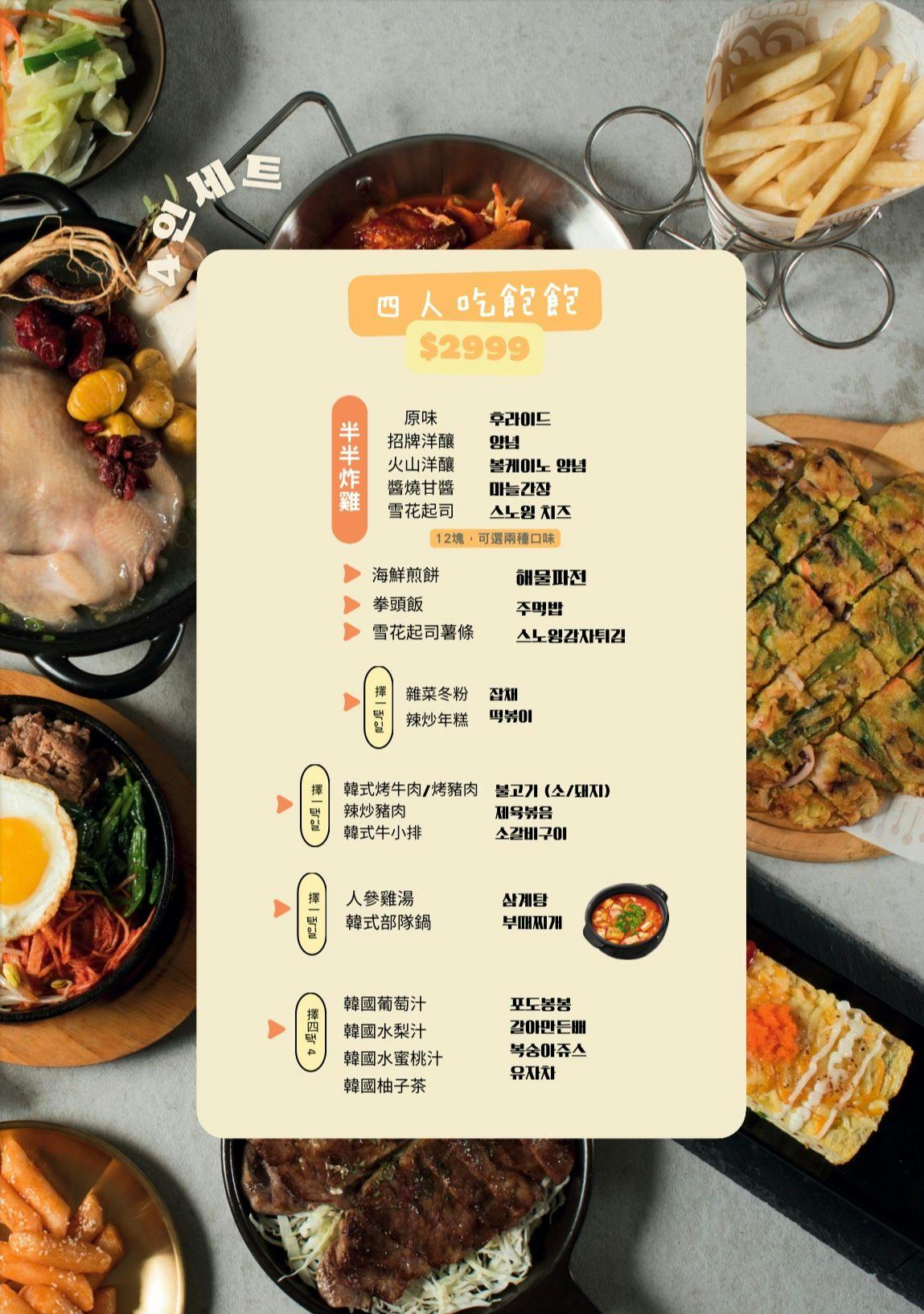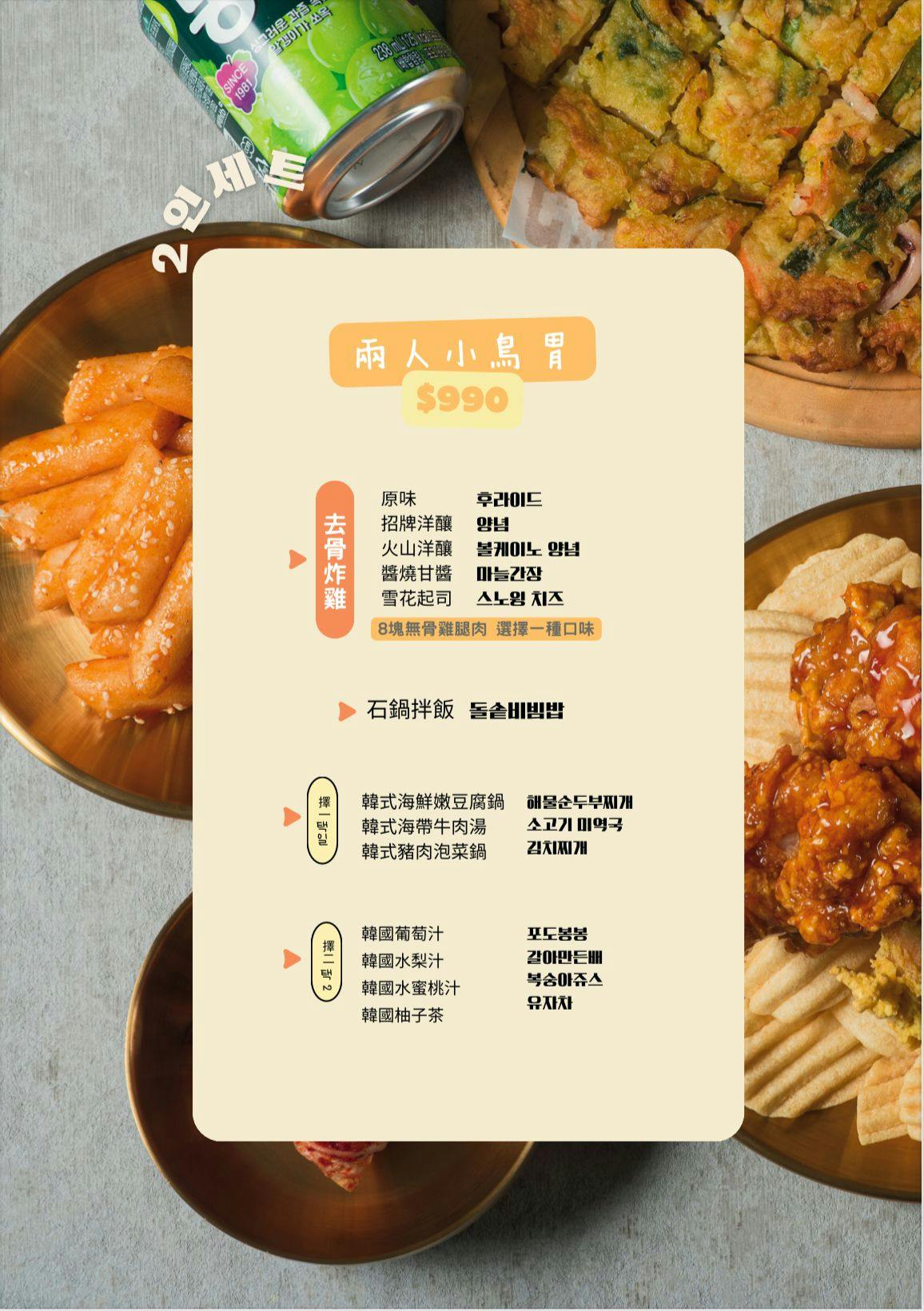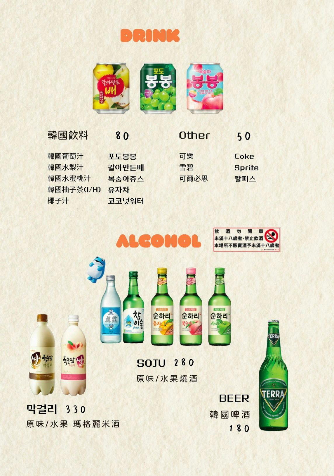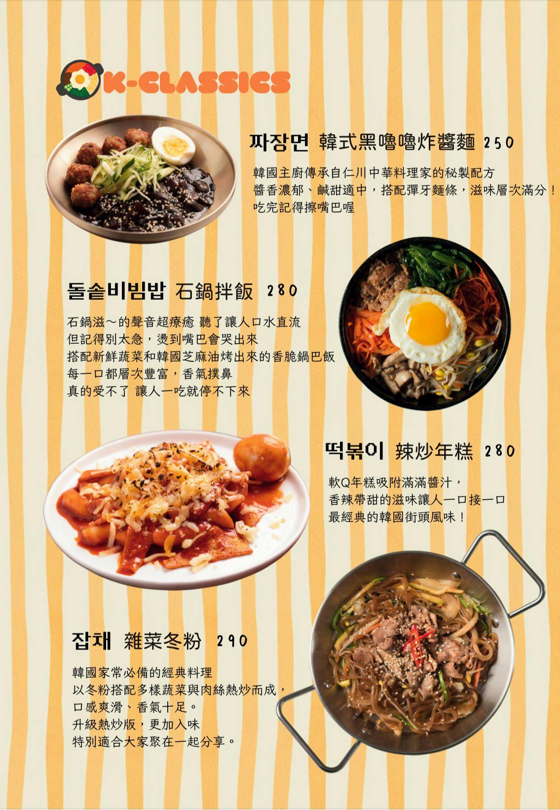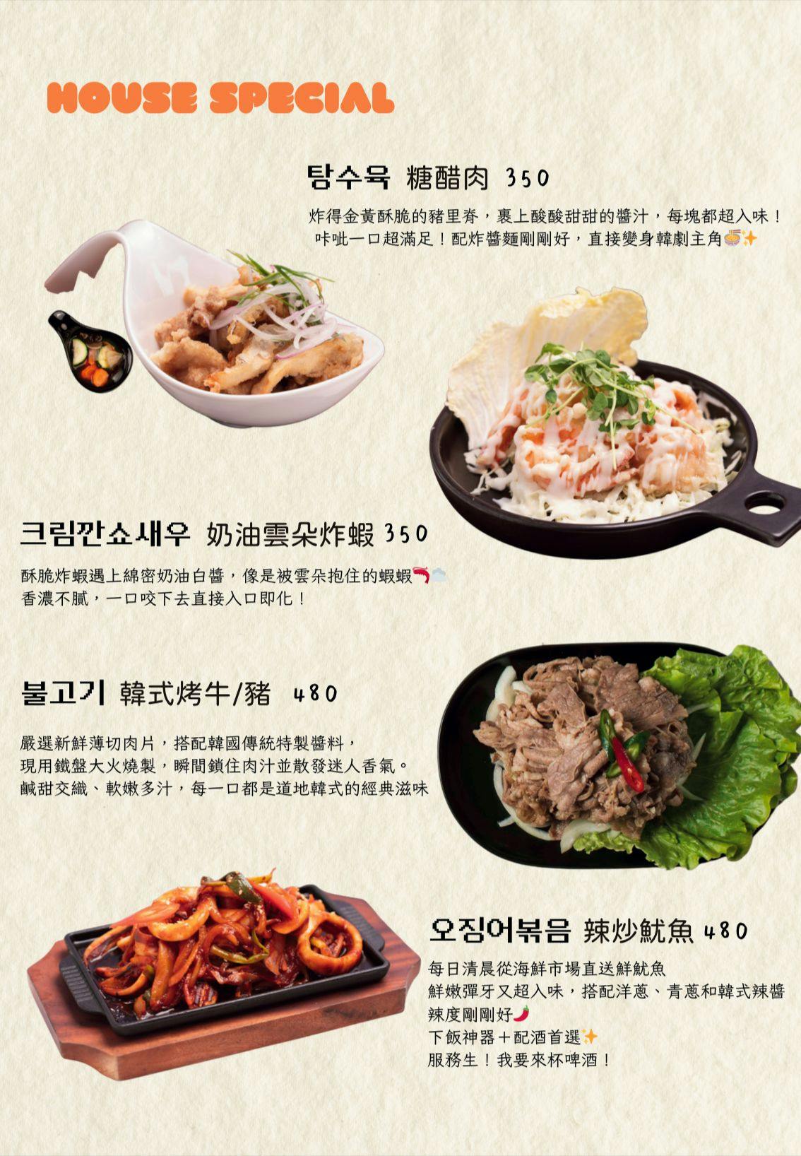 不僅空間換了設計,就連菜單也跟著更換!招牌的炸雞多了新口味,經典的韓式餐點再到韓國中式餐點也都有不少選擇!此外在湯鍋的部分,有部隊鍋、人蔘雞湯等多種品項。