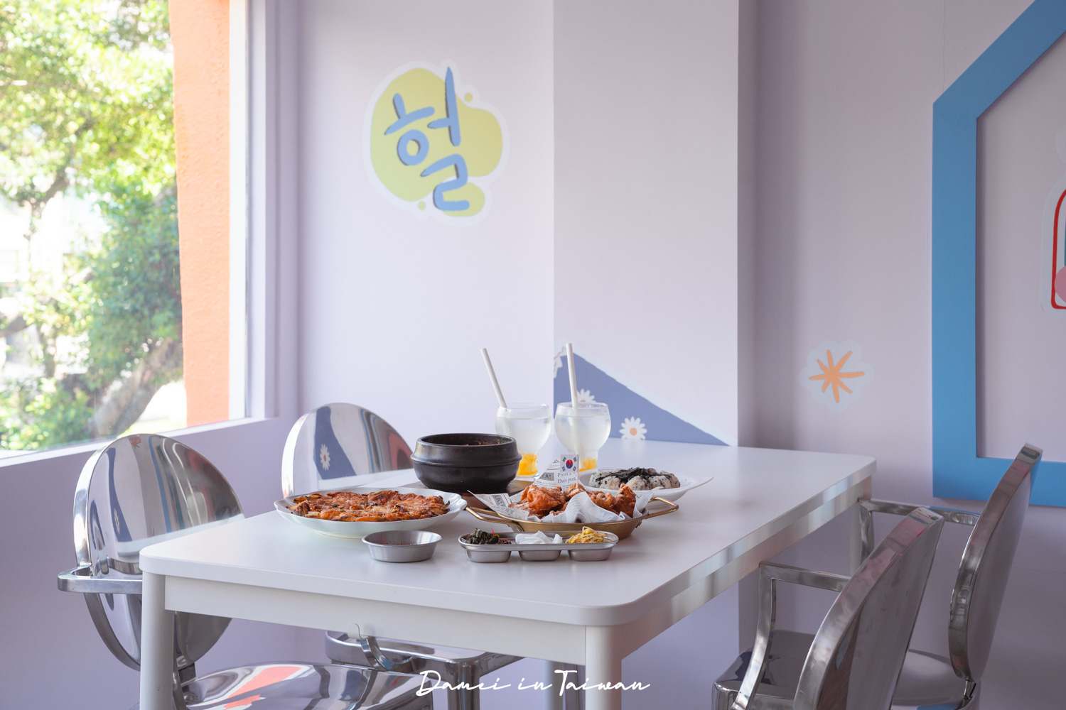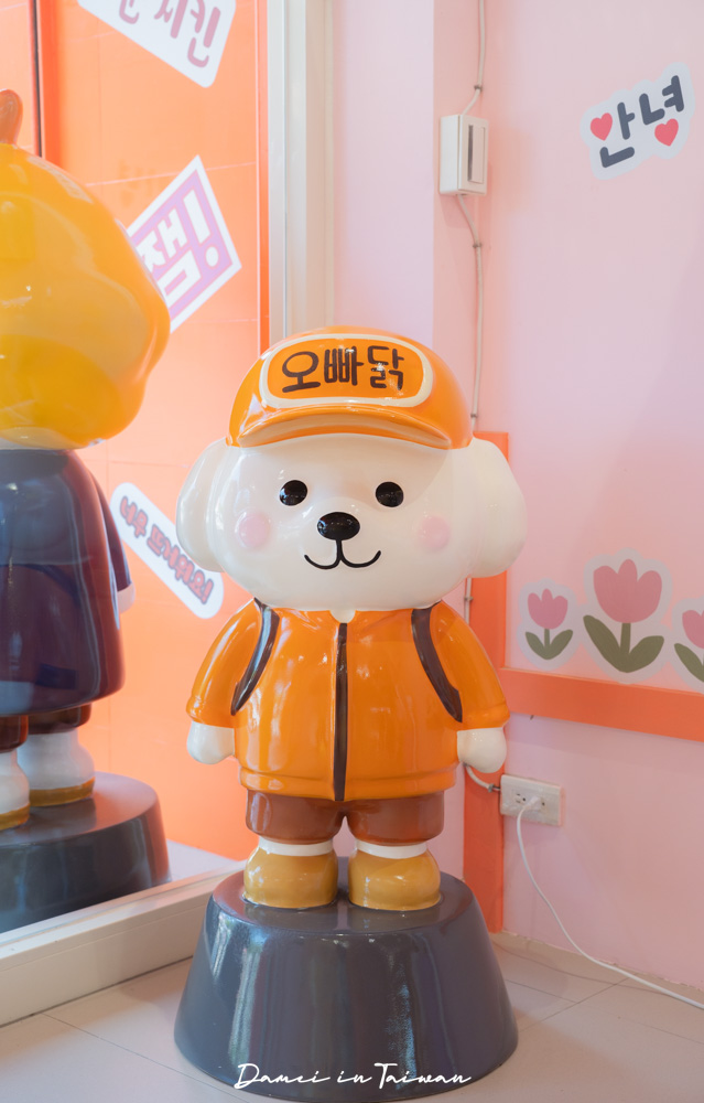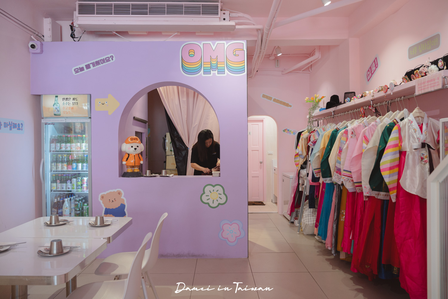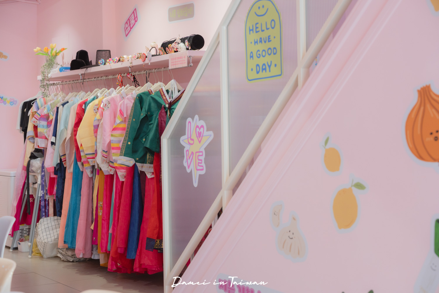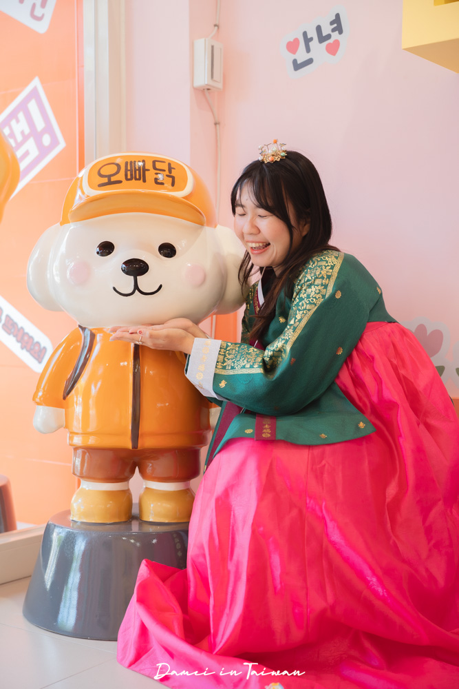 用餐就可以免費穿韓服,多種不同款式能夠選擇,甚至還有提供髮飾,不會穿韓服的話,店家也會協助穿搭哦。店裡這麼好拍,不穿一下實在太可惜!最後我選擇跟泡菜歐膩、炸雞歐巴的寵物狗狗合照,它真的超可愛啦(尖叫)