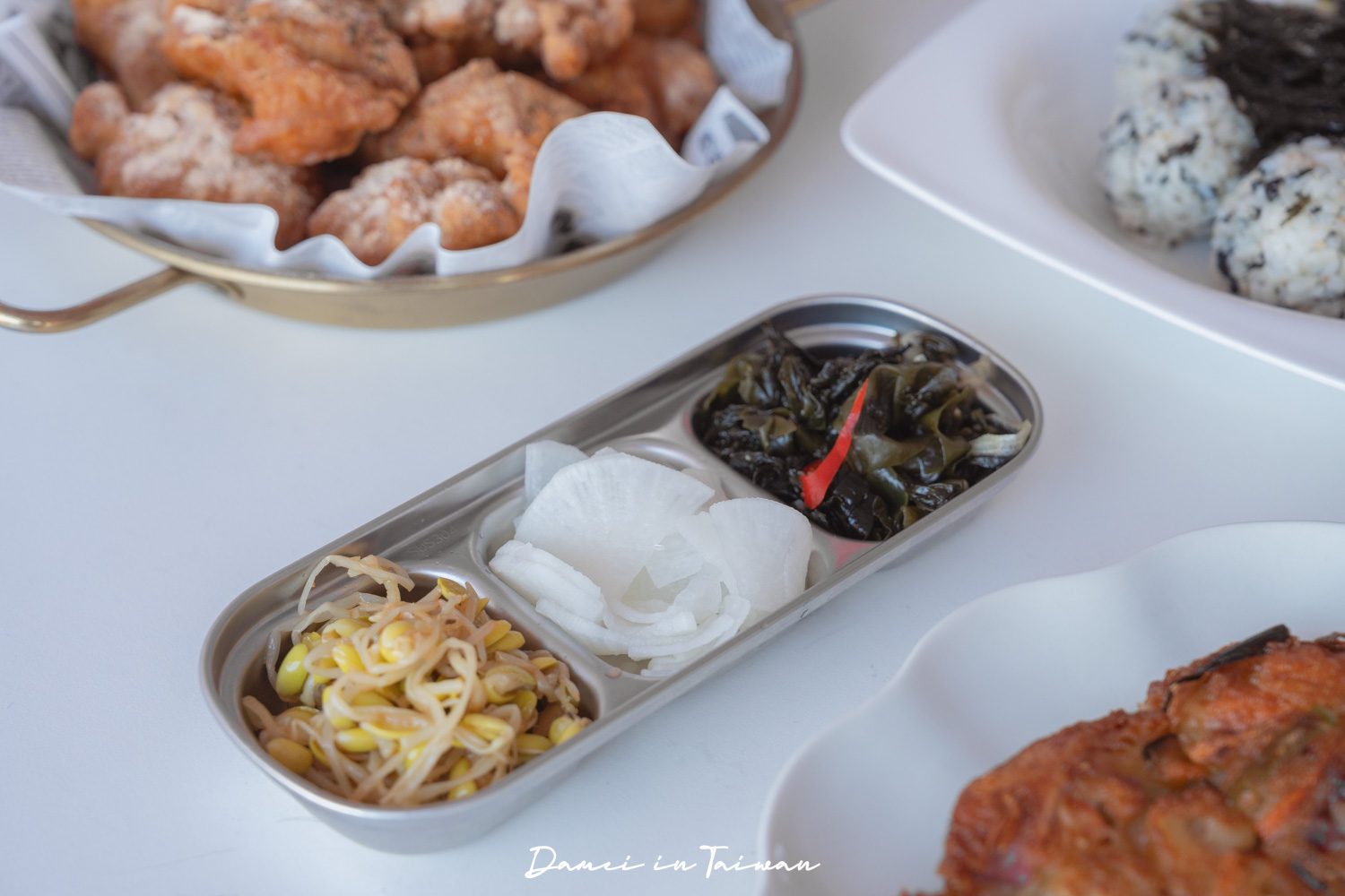 這日提供三款小菜,海帶芽、蘿蔔以及涼拌豆芽。