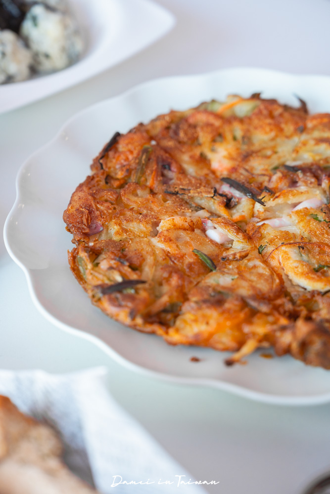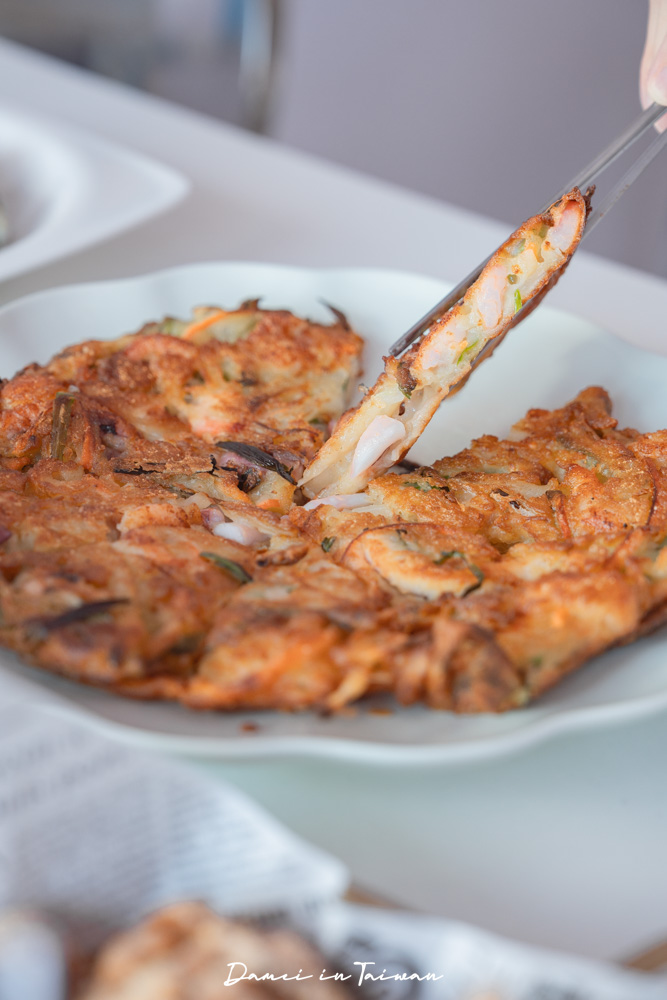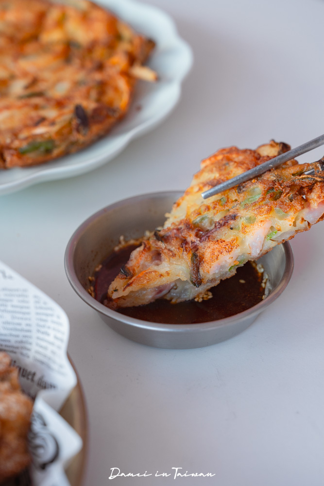 印象中他們家的海鮮煎餅是我每去必點的一道料理,光看這煎得金黃酥脆的表皮,就知道這肯定不得了(笑)加入蝦子、魷魚、蔬菜等,每一口都吃到海鮮,不沾醬味道就很足夠,煎餅皮也不會太厚,基本上都在吃海鮮啊~