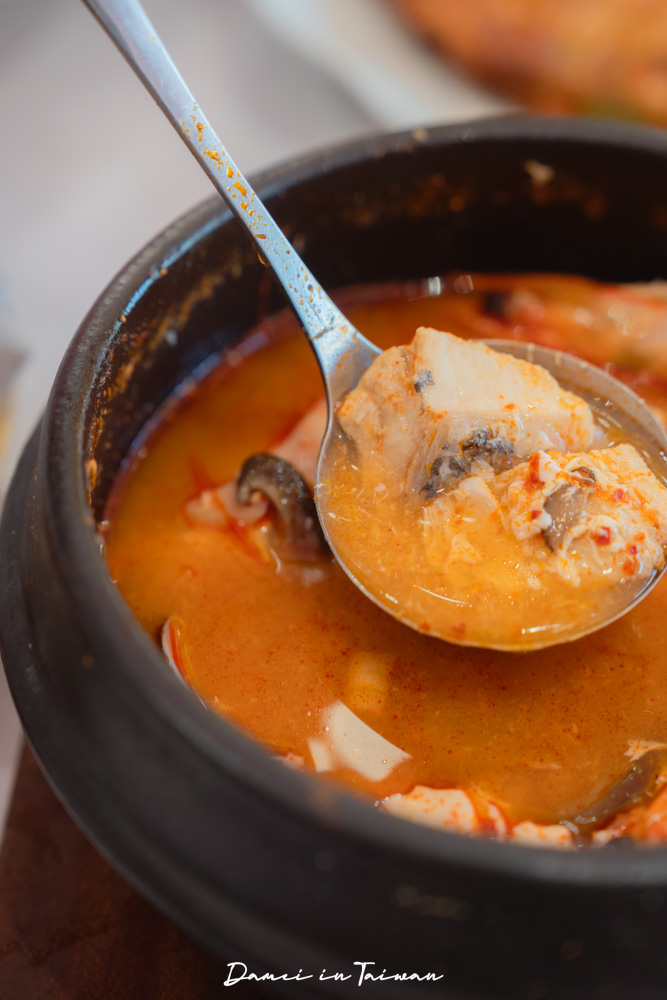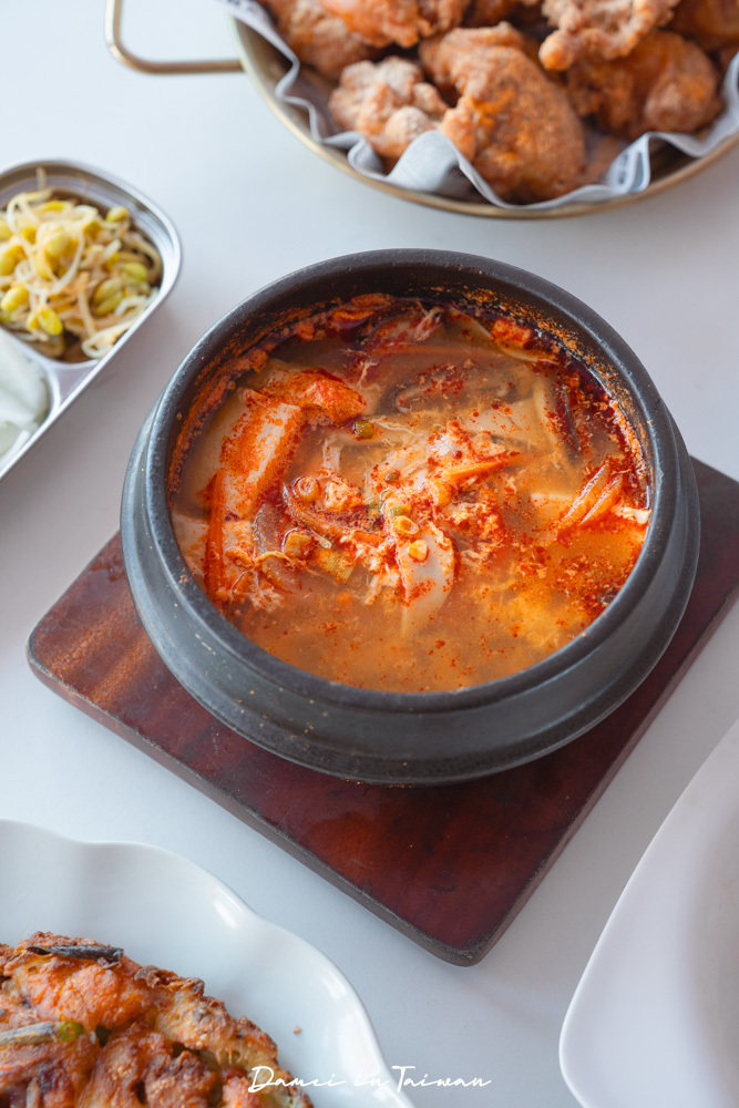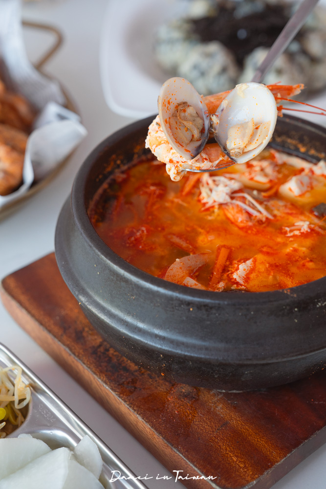 韓式海鮮嫩豆腐鍋的海鮮給的還不手軟,有蛤蠣、蝦子、鮮魚、花枝等,不過喝起來比較清爽,對於不敢吃辣的同學來說,無疑是不錯的選擇。
