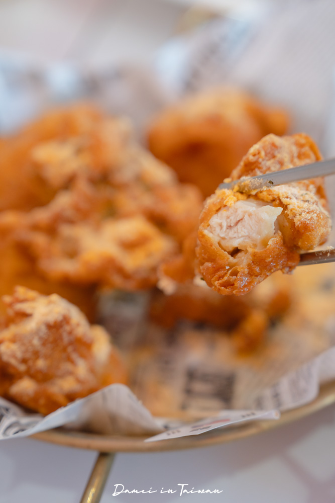 「等一下,這炸雞也太大塊!」我跟朋友看到炸雞上桌,第一個反應就是如此,甚至笑說我們兩個女生吃這就會很飽(笑)第一次嘗試雪花起司去骨炸雞,使用8塊無骨雞腿肉,起司鹹甜唰嘴不膩口,加上雞腿肉相當肥美且外皮不會太厚,沒錯就是我印象中優秀的炸雞啊。