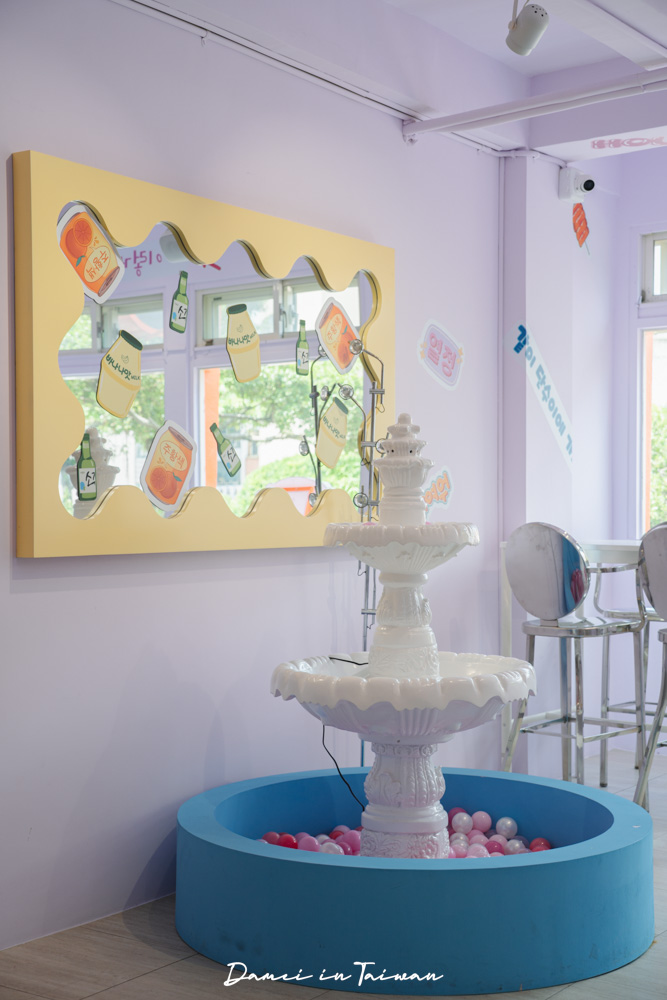 重點是超多鏡子好拍,甚至還搬了小小噴水池,我的天!歐吧噠韓餐酒 淡水店很懂現在女生喜歡的東西欸。